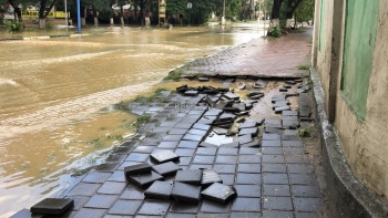 Так, дорога от СРЗ перекрыта. Проезжая часть у исполкома затоплена, легковой автомобиль не пройдет. Рабочие чистят левнёвки, говорят, что с утра здесь столько воды не было. У торгового порта вода, по сравнению с ночью, сходит. Но проезд все еще перекрыт. Пройти и не намокнуть не получится - вода суть ниже колена. Здесь и арбузы, которые потоком принесло с оптового рынка.