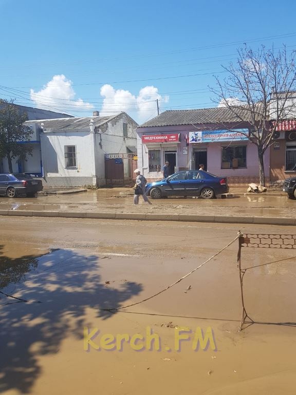 До улицы Козлова дойти можно нормально, а вот по Козлова от перекрестка с Карла Марка, как и по самой Карла Маркса - сложнее. На проезжей части еще есть вода, на тротуарах грязная и вязка жижа, которую не везде перепрыгнешь. Места для заезда во дворы и вовсе затоплены, керчане кладут палеты и ящики, чтобы люди могли здесь перейти.