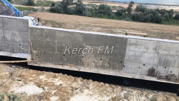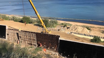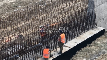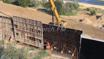 Так, рабочие завершили забивку свай и доваривают арматурные каркасы. На такие каркасы ставят специальные щиты с помощью техники, а уже их заливают бетоном. Большие резервуары для сбора воды уже установлены ближе к берегу.