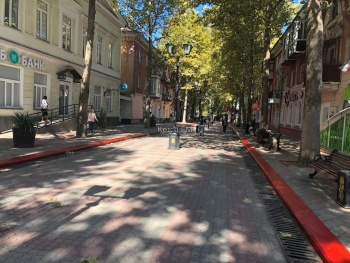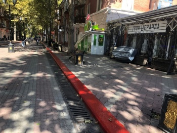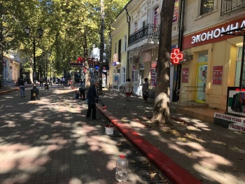 С утра 8 сентября работы идут по ул. Ленина. Бригада рабочих сначала очищает бордюры от пыли и листвы, а потом красит в яркий красный цвет.