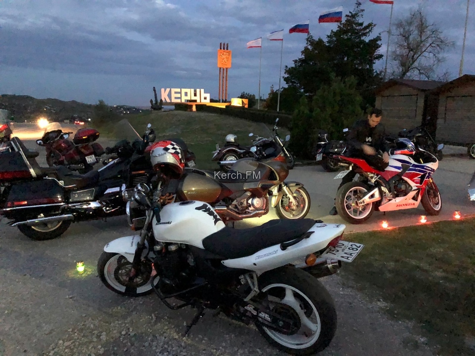 Из центра города колонна отправилась на выезд из Керчи к стелле. Мотоциклисты зажгли свечи, пустили ракетницы в небо и почтили погибших мотоциклистов минутой молчания.