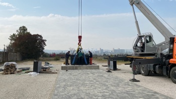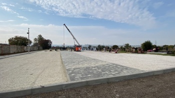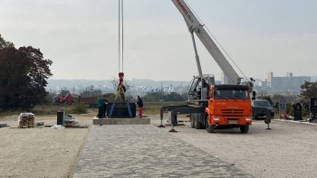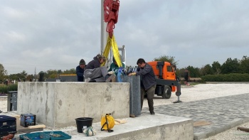 Сегодня, 12 октября, рабочие приступили к облицовке мемориала. Специалисты с помощью спецтехники устанавливают и закрепляют гранитные плиты.
