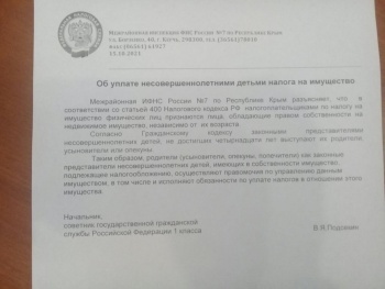 За разъяснениями редакция обратилась в ФНС № 7 по Республике Крым. Оказалось, что уплачивать налог за своих несовершеннолетних детей должны их родители. Это тем более актуально сейчас, когда многие семьи купили квартиры с учетом материнского капитала и стали владельцами недвижимости вместе с несовершеннолетними детьми в долях.