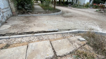 На улице все также снят асфальт, частично открыты люки, местами установлены новые бордюры. Напомним, заказчиком выступает ГКУ РК "Служба автомобильных дорог Республики Крым", подрядчик — ООО "РСК".