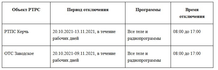 Филиал РТРС «РТПЦ Республики Крым» уведомляет, что на объектах: РТС Керчь, РТС Заводское будут проводиться работы, связанные с отключением вещания, - передает Керчь.ФМ.