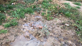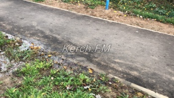 По словам керчан, вода не просто течет по земле, она уже много дней подмывает новую пешеходную дорожку.