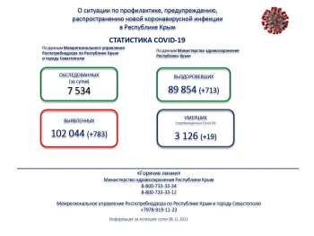 За сутки в регионе обследовано на коронавирус 7 534 человека. Выздоровели 713 человек, умерли - 19 пациентов. Всего с начала пандемии в Крыму выздоровело 89 854 человека, скончались - 3 126 человек.