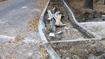 На месте осталась асфальтоукладочная техника. Рабочие продолжают делать будущую пешеходную дорожку.