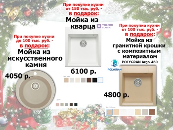 - мойка из кварца, гранитной крошки или искусственного камня в подарок при заказе любой кухни;
