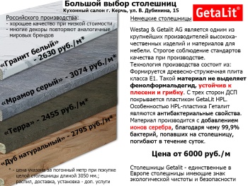 Большой выбор немецких столешниц Getalit и отечественных производителей.