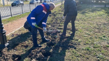 Зеленхоз заранее подготовил лунки. На место высадки также организовали подвоз воды для полива растений.
