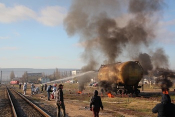 «Согласно тактическому замыслу, около 10 часов утра в результате столкновения легкового автомобиля с поездом на железнодорожном переезде произошёл сход с рельс железнодорожной цистерны, заполненной нефтью. В считанные минуты произошла разгерметизация котла цистерны, с последующим разливом нефти и воспламенением на площади более 400 кв.м. Возникла угроза взрыва и распространение огня на соседние цистерны. Как правило, в реальных условиях, уже через 15-25 минут цистерна взрывается, а пламя поднимается на высоту 100 метров. При этом осколки цистерны, массой до нескольких десятков килограмм, отбрасываются ударной волной взрыва на расстояние до 80 м. Пожар может с лёгкостью распространится на ближайшие поезда, складские и другие здания станций, а иногда и на жилые дома», - говорится в сообщении.