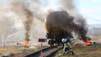 «В этот раз, к ликвидации условного огня был привлечен Пожарный поезд. Этот железнодорожный состав, предназначен для тушения пожаров, а также для оказания помощи при авариях, крушениях, возгораниях и других стихийных бедствиях. Сегодня личный состав этого подразделения осуществлял подачу огнетушащих веществ на условно горящую цистерну и рядом стоящие железнодорожные составы», - рассказывают министерстве.