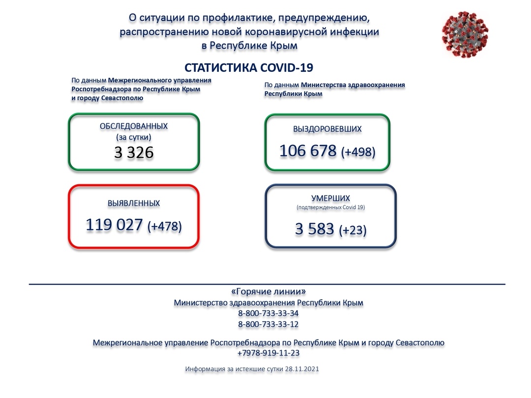 По данным Межрегионального управления Роспотребнадзора по Республике Крым и городу Севастополю за 28 ноября 2021 года на территории Республики Крым зарегистрировано 478 случаев новой коронавирусной инфекции, всего выявлено 119 027 положительных на Covid-19. Об этом сообщает пресс-служба Минздрава Крыма, - передает Керчь.ФМ.