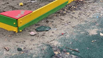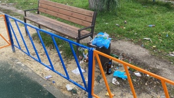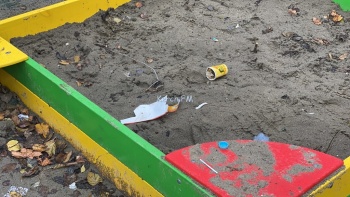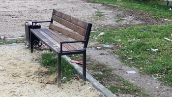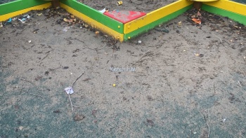 Напомним, напольное покрытие пришло здесь в негодность спустя месяц после открытия площадки. На сегодняшний день уборку на площадке никто не проводит. В песочнице мусор, на площадке и около скамеек тоже.