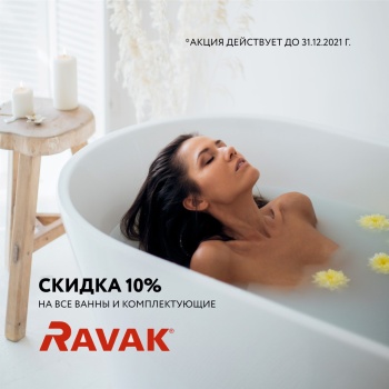 Разнообразие форм, эргономичность, качество, дизайн — это лишь малая часть преимуществ акриловых ванн от надежного производителя Ravak! Только то 31.12.21 вы можете приобрести любую ванну и необходимые комплектующие от Ravak с приятной скидкой 10%.