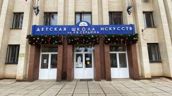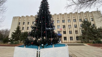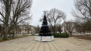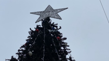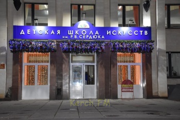 В Керчи появилась еще одна новогодняя ёлка. Её установили на площади около школы искусств им. Сердюка. Кроме этого, рабочие украсили и главный вход в здание школы.