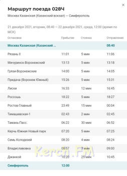 Так, теперь отправление в Москву со станции Керчь Южная в 21.54, а прибытие из Москвы в Керчь в 7:20. Время в пути от Керчи до Москвы на поезде 23 часа 49 минут. Цена нижней полки в купе от 5102 рублей, верхней 3382.