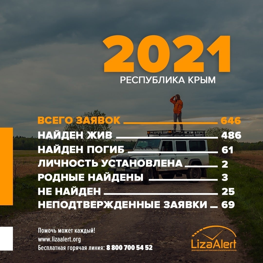 Поисково-спасательный отряд «ЛизаАлерт» Крым подвел итоги работы за 2021 год. Волонтеры за 2021 отработали 646 заявок и нашли живыми 486 человек. Итоги опубликовали на своей странице в ВК, - передает Керчь.ФМ.