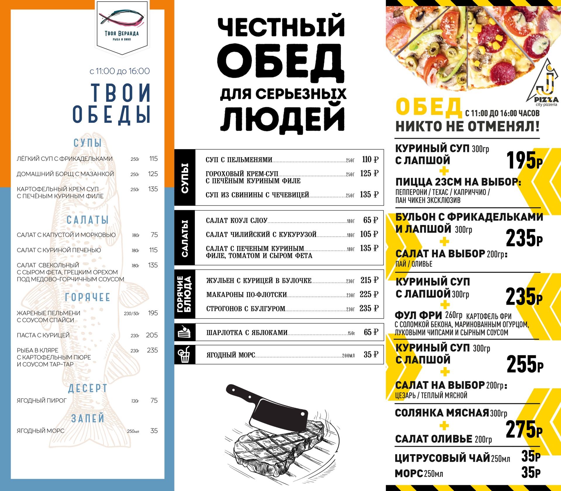 Готовим вкусные обеды по честным ценам всю неделю с понедельника по пятницу с 11:00 до 16:00, залетайте. Если нет возможности прийти к нам в гости, вы можете забрать обед с собой или мы привезём всё прямо к вам!