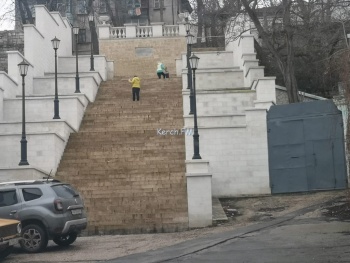 В Керчи 21 января на улице Театральной наводят порядок. Коммунальщики моют Константиновскую лестницу. Из спец оборудования у них швабра, тряпка и ведро. Кроме этого, сотрудники «ЖИЛСервисКерчь» приступили к ремонту парапета, который фуры повредили. Надеемся, что работы завершат, а не бросят, когда глава Крыма уедет из Керчи, - передает Керчь.ФМ