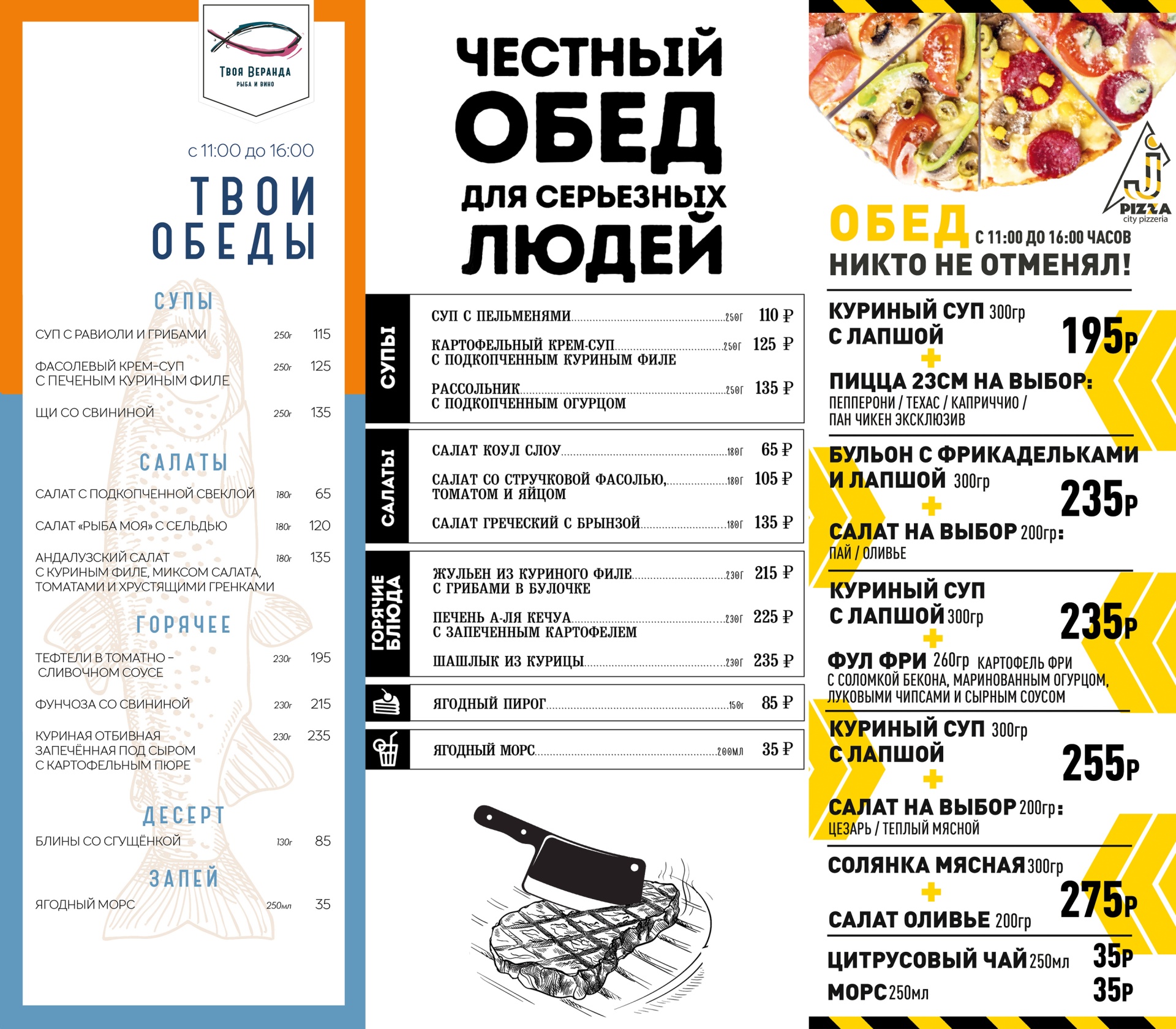 Вкусные обеды по честным ценам, готовим всю неделю с понедельника по пятницу с 11:00 до 16:00, залетайте. Если нет возможности прийти к нам в гости, вы можете забрать обед с собой или мы привезём всё прямо к вам!
