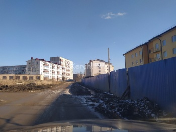 Из-за дома для переселенцев, строительство которого подходит к концу, дорожное полотно разрезали, и теперь там на дороге канава. Выезжающие со стройки машины развезли грязь, из-за этого срезанные обочины еще больше сузили. Для отвода накопившейся воды вдоль дороги прорыли траншею. А упавший бетон застыл на дороге.