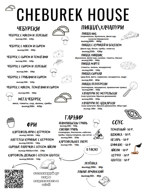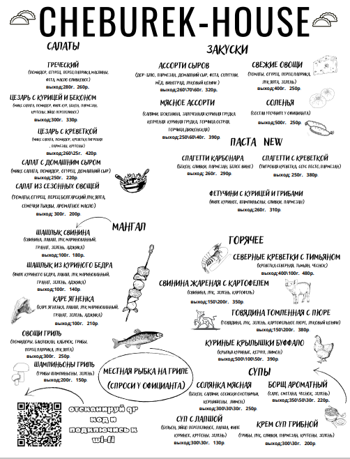 А так же пиццы, хачапури, сувлаки, салаты, пасты, первые блюда, горячие блюда, шашлык и блюда на мангале.