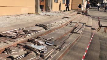 Двух львов, «охранявших» вход по бокам, сняли и положили рядом с ремонтными работами. Часть лестницы оградили стулом и сигнальной лентой. Рабочие с помощью перфоратора разбивают гранитную плитку и складывают у основания в кучи. Лишь немного плитки остается целой.