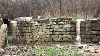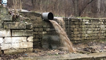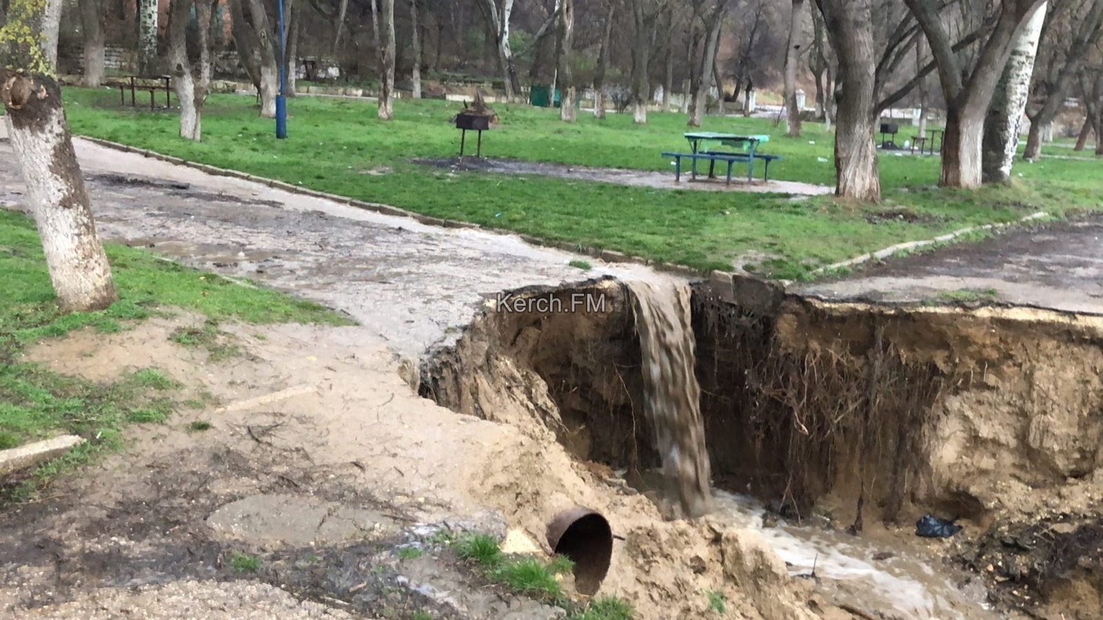 Дальше вся эта бурлящая жижа, водой сложно назвать, поскольку здесь и земля, и камни, и даже мусор течет по остаткам асфальта, когда-то уложенного здесь и стекает с обрыва, разрушая дорогу. Оползень за эту зиму, который появился пару лет назад, стал просто огромных размеров. Здесь, в месте обвала дороги, поток воды и вовсе превращается в настоящий водопад, а ливневая труба, уже разломанная из-за оползня, лежит по соседству. Но толку от нее все равно никакого, по ней вода не идет совершенно.