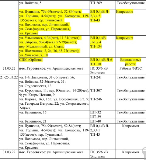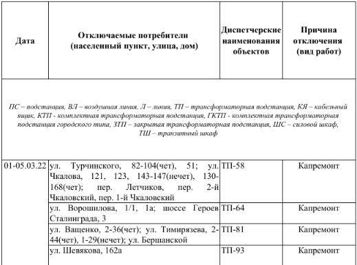 Ремонт электрооборудования позволит обеспечить надежное и стабильное энергоснабжение. Просим с пониманием отнестись к отключению электроэнергии», - сообщает ведомство.