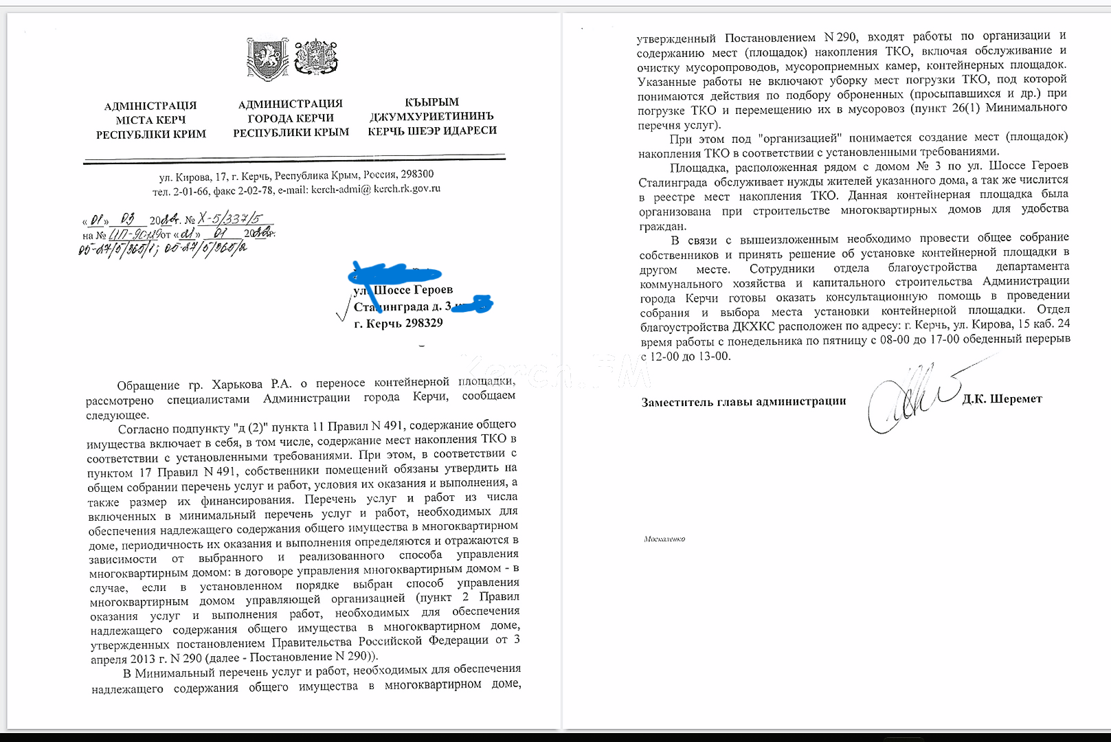 Администрация Керчи за подписью замглавы администрации Шеремета предоставила ответ, которым хоть и не отказала в переносе контейнерной площадки, но «понадавала» советов хоть лопатой греби.