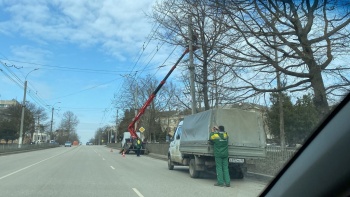 Работы проводят сотрудники зеленхоза. Напомним, что на Славы над дорогой свисает ветка.
