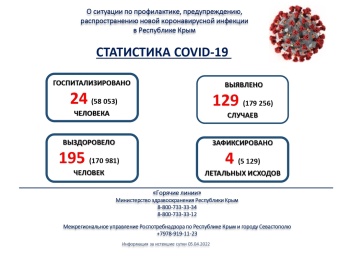 За 5 апреля 2022 года на территории Республики Крым зарегистрировано 129 случаев новой коронавирусной инфекции, всего выявлено 179 256 положительных на Covid-19. Об этом сообщает пресс-служба Минздрава Крыма, - передает Керчь.ФМ.