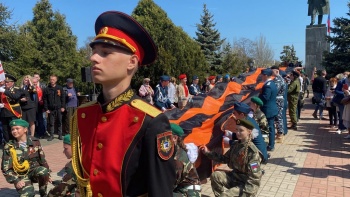 В ходе торжественной части присутствующим раздали георгиевские ленты.