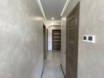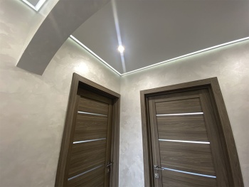 Для решения ключевой задачи по расширению пространства были применены зеркала и многоуровневое освещение, а общий светлый тон керамогранита визуально сделал пространство больше.