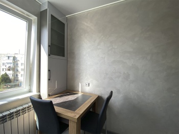 Применили наиболее вместительную расстановку сантехнических приборов и сместили проем для двери под новую планировку. За счет лаконичных декоративных элементов создали нескучный образ.