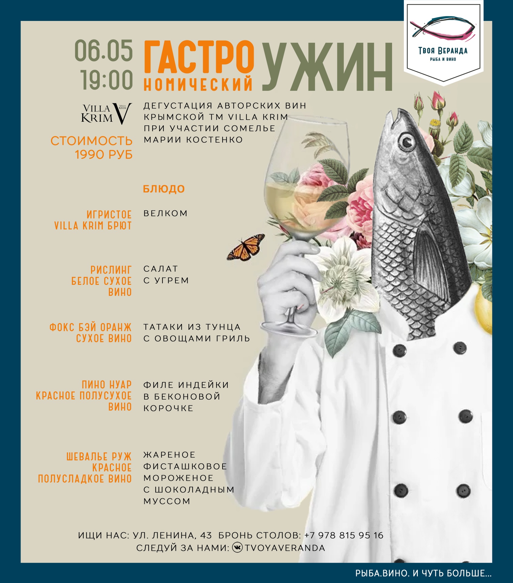 Друзья, уже 6 мая, встречаемся в Твоя Веранда. Рыба и вино на гастрономический ужин и дегустацию напитков с крымским характером ТМ «Villa Krim» при участии сомелье Марии Костенко.