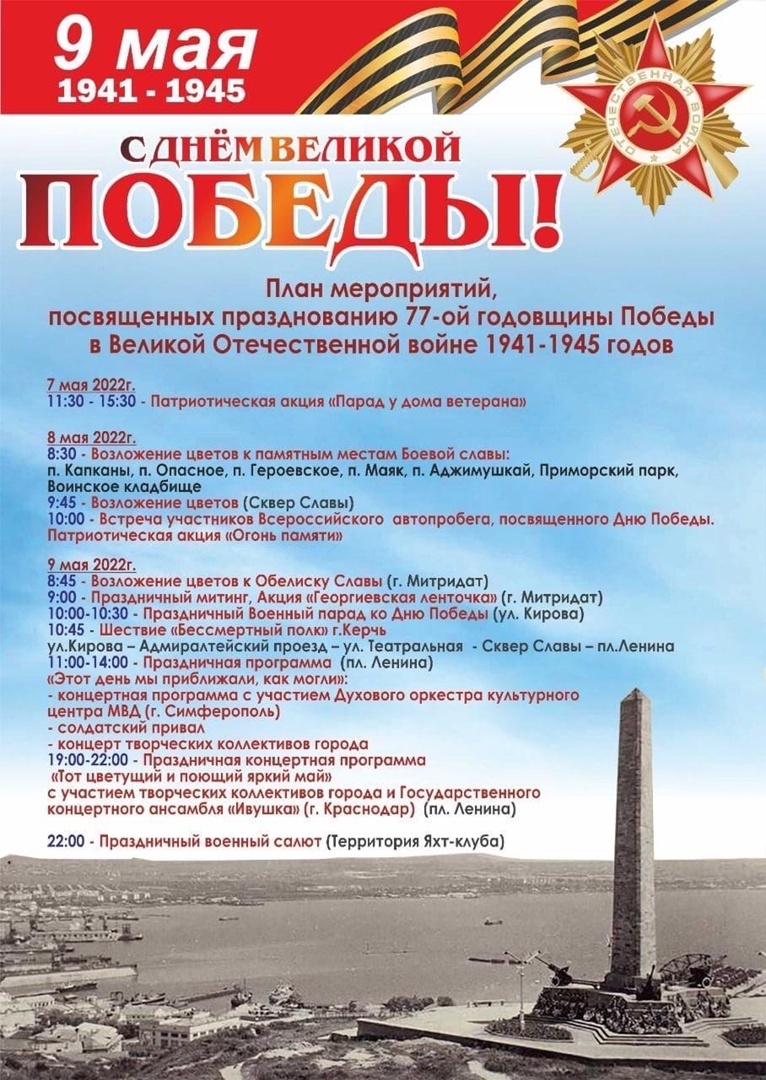 Администрация Керчи опубликовала план мероприятий, которые пройдут в городе в честь Дня Победы, - передает Керчь.ФМ.