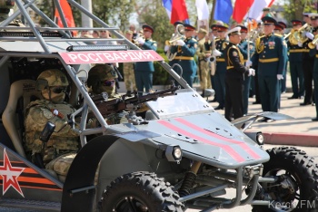 После приветствия участников парада, солдаты прошли пешим строем, проехала колонна военной техники, более 20 единиц.