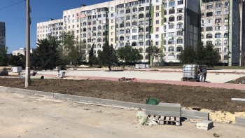 Сейчас рабочие завершают укладку тротуарной плитки. На площадках с резиновым покрытием планируют разместить игровое оборудование для детей и спортивные элементы.
