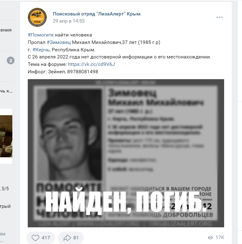 Пропавшего перед майскими праздниками керчанина нашли. К сожалению, парень погиб. Информацию об этом разместил на своем ресурсе поисковый отряд Лиза Аллерт, - передает Керчь.ФМ.