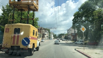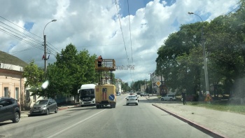 В Керчи с утра 27 мая рабочие с помощью техники снимают праздничные флажки в центре города. Эти флажки развешивают над проезжей частью перед значимыми праздниками в городе, - передает Керчь.ФМ.