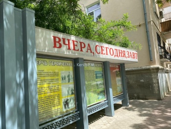 В Керчи 3 июня на улице Пролетарской реставрируют доску с информацией о городе. Рабочий демонтировал баннера и производит покраску металлической конструкции.