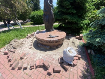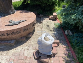 Часть плитки вокруг памятника сняли, для дальнейшей перекладки. Стоит отметить, что скульптурную композицию нужно вымыть - она вся в подтеках.