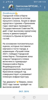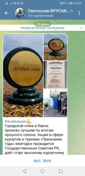 «Городской пляж в Керчи признан лучшим по итогам прошлого сезона. Акция в сфере курортов и туризма «Признание года» ежегодно проводится Государственным Советом РК, даёт старт высокому курортному сезону и демонстрирует готовность Крыма встречать гостей.