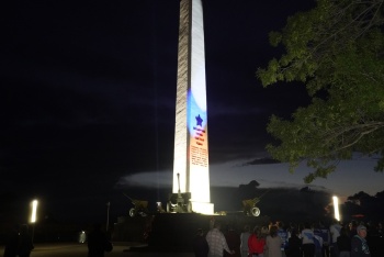 В Керчи яркими лучами в цветах государственного флага России осветили главный исторический символ города - Обелиск Славы на горе Митридат.
