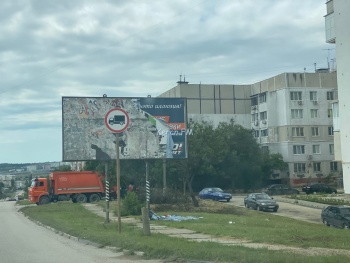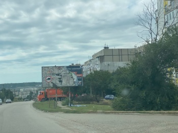 В Керчи на Куль-Обинском шоссе, около дома для депортированных с начала 2019 года пешеходная дорожка проходит под рекламным билбордом.