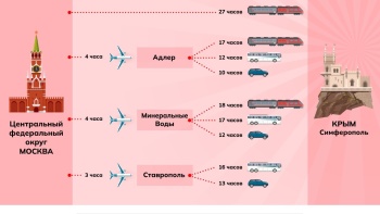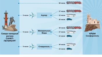Добраться на полуостров можно с пересадкой в Краснодарском крае, купив билеты на поезд до Краснодара или Анапы, а оттуда на автобус до крымских курортов.