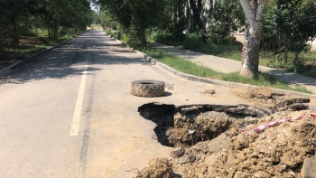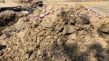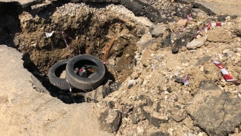 Место порыва раскопали, рядом насыпали кучу земли. С другой стороны никак не оградили провал диаметром в несколько метров. Отметим, этот участок дороги открыт для проезда транспорта